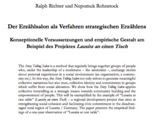 Der Soziologe und Kommunikations- und Medienwissenschaftler Dr. Ralph Richter und der Soziologe Nepomuk Rohnstock begleiteten für diesen Artikel das Lausitz-Projekt von Beginn an. Die beiden besuchten über die gesamte Zeit hinweg Erzählsalons und verfolgten dadurch die Entwicklung in den Projektstandorten. Darüber hinaus moderierte Nepomuk Rohnstock Erzählsalons als Salonnier, nachdem er die entsprechende Qualifikation im Salonnieren-Seminar erworben hatte. [Lesen Sie hier weiter]